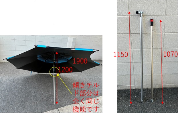 しかも、パラソルの支柱も下部の鞘部分も長さが10cmほど長くなっており可動範囲が増えています。